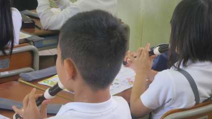 先生の指導する指づかいを一生懸命にまねしてふいています。