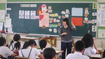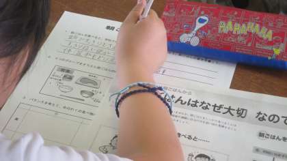 他校より栄養教諭に来ていただいて、5年生に栄養指導が行われました。今日のテーマは「朝ごはんを食べよう」です。みんな元気よく「朝ごはんを食べている」と答えていました。聞いてみると、「ごはん派」より「パン派」の方が多かったです。