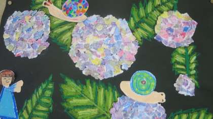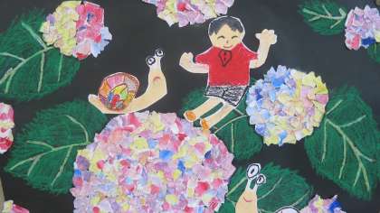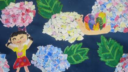 3年生がこつこつと仕上げてきた「あじさい」が完成して教室の後ろに掲示してありました。色とりどりのあじさいが教室を華やかにしています。一人一人個性を発揮し、ワンポイントで自分やかたつむり、カエルなどが登場しています。この作品を見ていると、なんだか梅雨も楽しくなってきそうです。