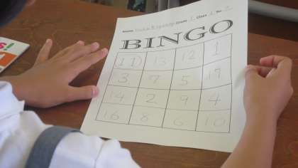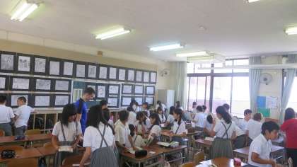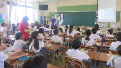 次に友だち同士で自己紹介しながら、Hello,how are you?と聞いてまわります。2枚目の写真はその活動のようすです。