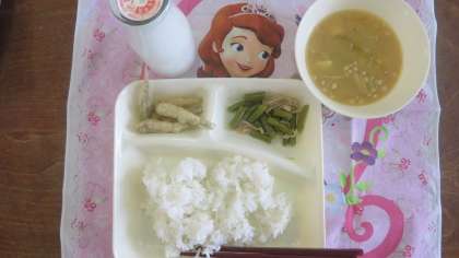 今日のメニューは、いわしのてんぷら、みそ汁、豚肉と三度豆の炒めもの、ごはん、牛乳でした。