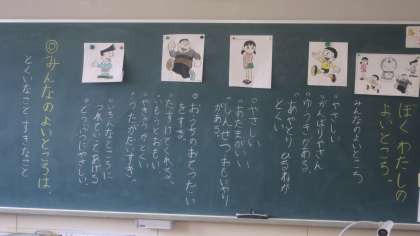 ジャイアンは乱暴で、スネ夫はいじわる、のび太は泣き虫ですが、いいところを発表していきます。子どもたちは意外にもたくさんのいいところを発表していました。やさしい気持ちを持っていて、感性が豊かなんですね。