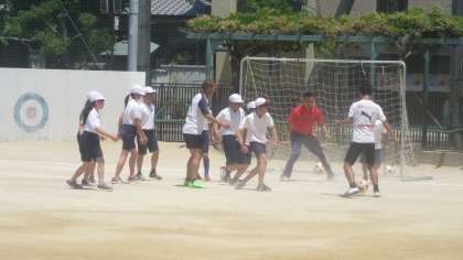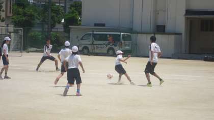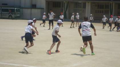 いよいよお楽しみのゲームです。しかもセレッソ大阪のコーチの方々との対戦です。全員が少しずつ対戦させていただきました。相手は二人です。子どもたちは8〜9人です。圧倒的有利なはずですが…、まったくボールにさわることができません。小刻みなステップに華麗なボールさばき、さすがです。プロの技です。それでもコーチは大幅に手を抜いています。子どもたちは必死にボールを取りに行きますが、かるくあしらわれてしまいます。「がんばれ〜」自然とまわりからも声援が起こりました。