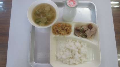 ちなみに今日の給食は、豚肉の梅風味焼き、すまし汁、切り干し大根の炒め煮、ごはん、牛乳でした。おいしかったです。