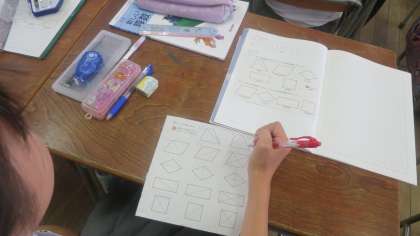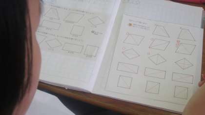 今日は、四角形(正方形、長方形、平行四辺形、台形、ひし形)をそれぞれ対角線を引いてできた三角形が合同であるかどうか調べていました。実際に自ら対角線を引いて、確認していました。
