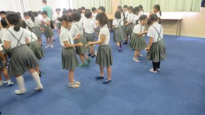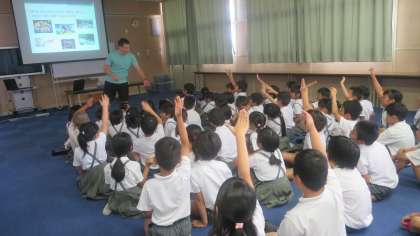 今日は3年生のところに、英語のライアン先生が来てくれました。普段ろうかですれちがったときに「ハロー」と進んであいさつはしていましたが、授業ははじめてです。はじめにライアン先生の国の話や自己紹介をしてもらいました。子どもたちも興味津々です。子どもたちも反対に好きなものなどを質問され、元気に答えていました。次にじゃんけんをしてカードをもらうカードゲームをして遊びました。子どもたちからも「たのしかったー」という声が聞かれました。