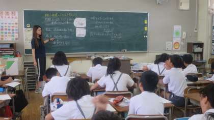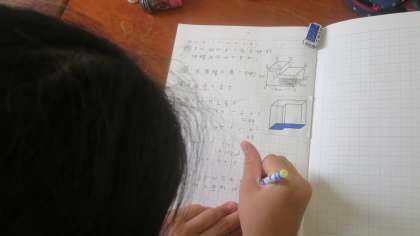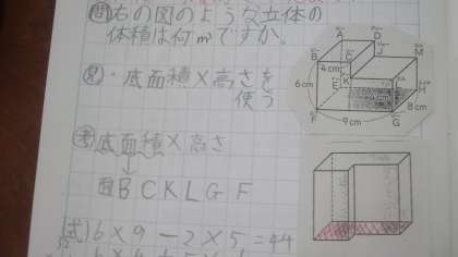 6年生が写真のような直方体を組み合わせた立体の体積を求めていました。