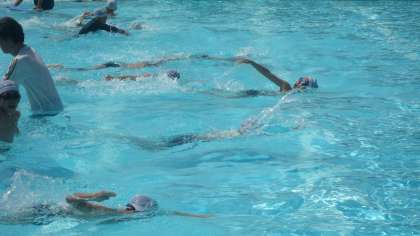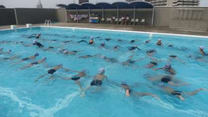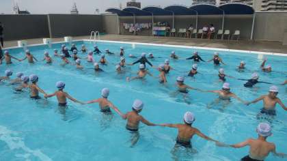 子どもたちは水しぶきをあげながら水泳授業を楽しんでいます。