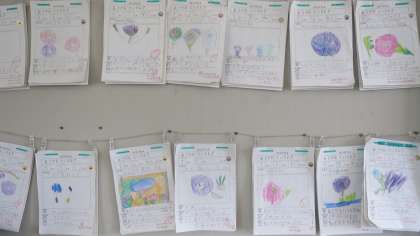 教室の後ろにアサガオのかんさつプリントが何枚もつづられて掲示されていました。めくっていくとアサガオの成長のようすと子どもたちの成長のようすがよくわかりました。