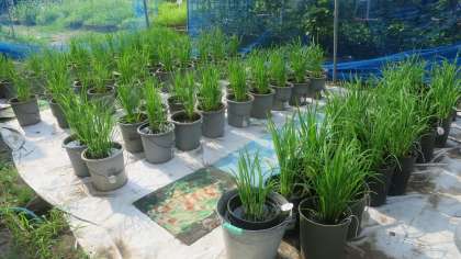 暑い日が続きますが、学習園は緑がまぶしいです。水をあげると、水滴が葉をすべり落ちて、とても喜んでいるように見えます。サツマイモの葉がおおいしげっています。今から収穫が楽しみです。5年生のバケツ稲もずいぶんと伸びてきました。
