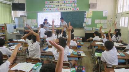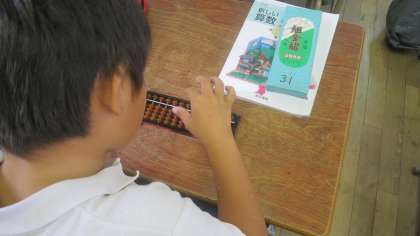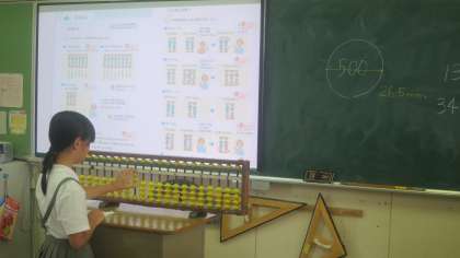 4年生がそろばんの使い方を学習していました。そろばんは教科書に2ページしか載っていなくて、ちょっとさわる程度になってしまうのですが、子どもたちは楽しそうに学習していました。やっぱり具体物があると子どもたちは興味を持ちますね。先生が提示する数字を入れてみたり、とても簡単なたし算やひき算に挑戦したりしていました。今は家庭でもほとんどそろばんを使いませんね。なつかしい気がしました。