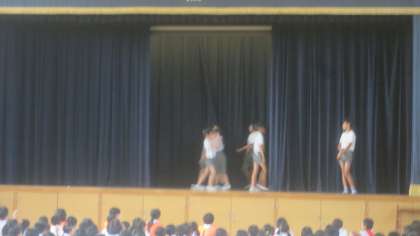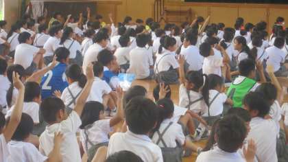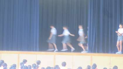 3m程度開けられたカーテンの間を集会委員会の子どもたちが行ったり来たりします。その人数を当てるゲームです。なんとも原始的なゲームですが、ちょっとした工夫がされていて難しかったです。それぞれ歩くスピードを変えていたり前から見てわからないように重なって歩いたりしていました。あちらこちらから「○人や!」「△人や!」と声があがっていました。