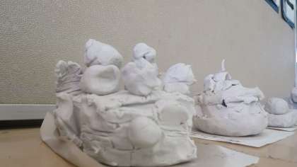 「切り糸」や「かきべら」という用具を使って、粘土を切ったりかき出したり、それをくっつけたりしながら形をどんどんと変えていきます。そしていろいろ試しながら表し方を工夫していきます。子どもたちなりにテーマをもって取り組んだそうですが、見ただけではちょっとわかりませんね(笑)でもなんか発想が豊かで楽しそうです。