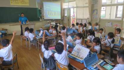 1年生がけんばんハーモニカの練習をしていました。指に番号をつけて同じ指ばかりでひかないようにがんばっていました。教え合っているようすも見られました。グループで練習して、最後にグループごとに発表していました。先生が「さあ、どこのグループから発表してもらおうかな?」「じょうずにできるグループからいこうかな?」と声をかけると、どのグループも自信たっぷりに「ハイハイッ!」と手をあげていました。それぞれの発表のあとにはしっかりと拍手もしていました。