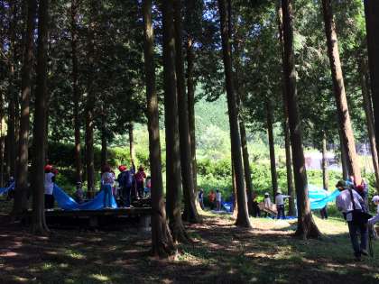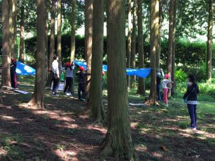 イニシアチブゲームが終わって、いよいよ秘密基地づくりです。グループで協力して、限られた材料で作っていきます。ここはひもでくくろう、とかダンボールで机を作ろうなどと、みんなの力が合わさった素敵な基地ができつつあります。