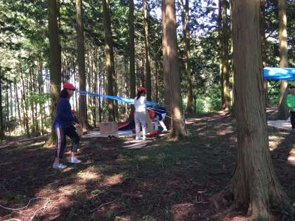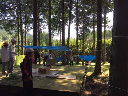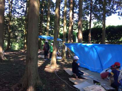 秘密基地が出来上がってきました。机や椅子、電球、などどんどん作っていっています。何よりみんなが話し合って、協力している姿が印象的です。個性的な秘密基地ができました。