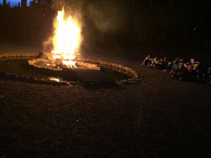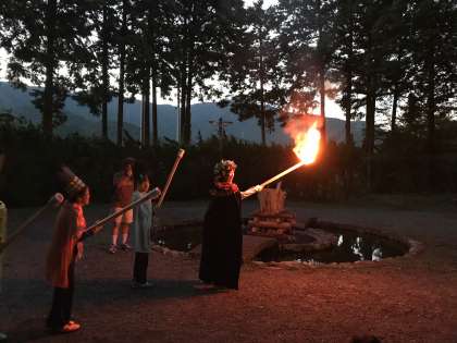 日が暮れてきて、火の神が登場してキャンプファイアが始まりました。この後、いろいろなゲームをキャンプファイア係の進行で楽しみます。