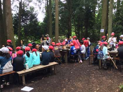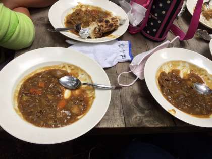 みんなでカレーをかまどで炊いて、パンも一人一本づつ焼きました。手作りのカレーは格別な味がしました。焼いているときの子どもたちの感想は、火のそばなのにあまり暑きを感じないのは、大阪とは違うなぁというもの。でも、火のそばでは、煙が目にしみて、大変というものでした。これも貴重な体験です。