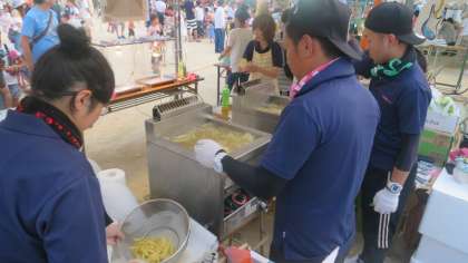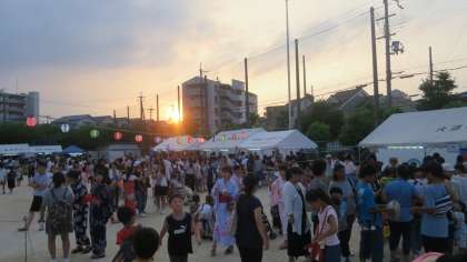 大道南盆踊り大会が盛大に行われています。たくさんの方々が大道南小学校の校庭に来場し、あちらこちらで子どもからお年寄りまで笑顔の輪が広がっています。各町会各諸団体の方々が趣向を凝らした出店を出し、大勢の人で大賑わいです。活気に満ち溢れています。PTA役員の方々も汗だくになりながらフライドポテトを揚げていました。