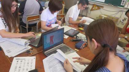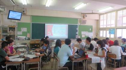 2学期から外国語活動(英語)の学習に各学年取り組んでいきます。高学年においては従来よりネイティブの先生と楽しく週に1時間外国語活動を進めているところですが、新たに全学年において水曜日の午後に15分間の時間を設定して、各学年の実態に合わせて外国語(英語)に慣れ親しむ活動に取り組んでいきます。本日は教員による研修会が行われました。手振り身振りを交えたあいさつや自己紹介、ほめ言葉の練習、パソコン教材の活用方法等について研修を深めました。先生たちも必死です。笑