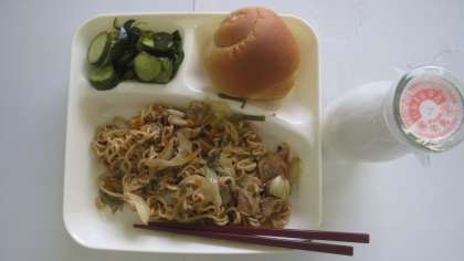 今日は2学期最初の給食です。メニューは焼きそば、きゅうりとわかめの中華和え、パン、牛乳でした。焼きそばは、細かく刻まれたにんじん、たまねぎ、ピーマン、キャベツがソースと一緒にちぢれめんにからんでおいしかったです。豚肉やいかも入っていてボリュームもありました。きゅうりとわかめの中華和えはさっぱりして暑さを忘れさせてくれました。みんなしっかりと食べていました。