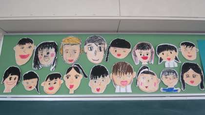 2年生が筆算の学習に取り組んでいました。プリントを使ってくり返し練習していきます。のぞいてみると、結構むずかしいです。例えば「39+49」のようにくり上がりのある計算や「84−48」のようにくり下がりのある計算に取り組んでいました。一生懸命に指を折って数えている子もいて、かわいらしかったです。教室の前上に自分で描いた似顔絵が掲示してあり、どの子がどの絵かなと見て回りましたが、こちらの方も難しかったです。