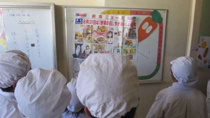 給食室の壁には食育や食べ物に関する掲示物がときどき貼ってあります。子どもたちはいつもそれをよく見ています。内容が変わると、すぐさま気づいて見入っています。「今回の記事は何かなあ?」