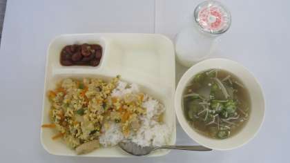 今日の給食のメニューは親子丼、とうがんのすまし汁、金時豆の煮もの、牛乳でした。少し甘めの和風だしが効いた親子丼に子どもたちの食欲も進みます。とうがんのやわらかい食感も楽しめました。金時豆は甘かったです。