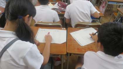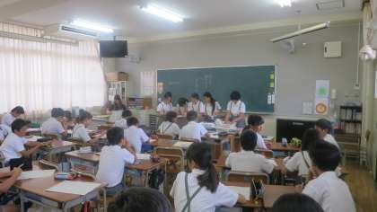 算数の時間に6年生が自分たちでプリントの答え合わせをしていました。内容は「比」「比の値」についてでした。おそらく学習係でしょうか。みんなを静かにさせて、てきぱきと進めていきます。聞き漏らした友だちにも再度ていねいに教えてあげていました。