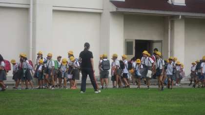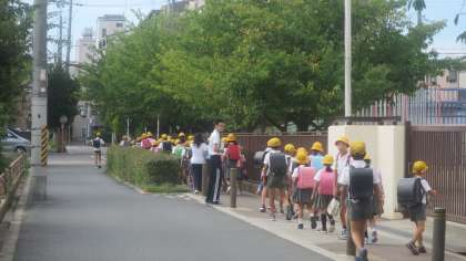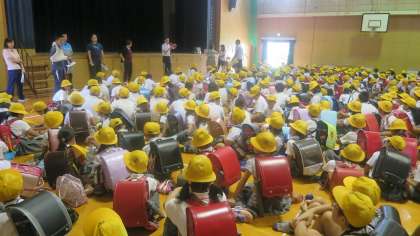 5時間目に避難訓練と集団下校を行いました。台風のために暴風警報が発令されたという設定です。まず全員が講堂に避難し、各町会分団別に並び直しました。班長さんが分団の数字を頭上高くに掲げ、みんなが順に並んでいきます。人数確認した後、集団下校を行いました。各担当の先生が集合場所まで一緒に付き添いました。子どもたちも出際よくスムーズに動くことができていました。