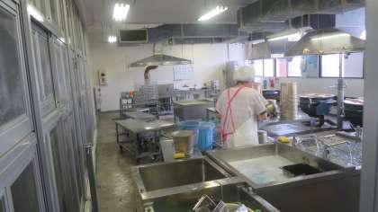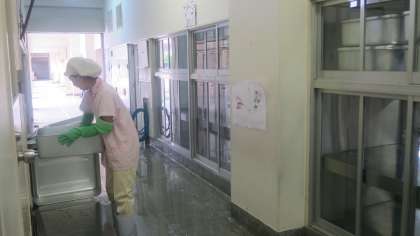 みんながおいしい給食を食べたあとも給食調理員さんは大忙しです。明日の給食に向けて使った食器や食缶などをきれいに洗い消毒していきます。さあ、明日の給食は何かな?楽しみです。