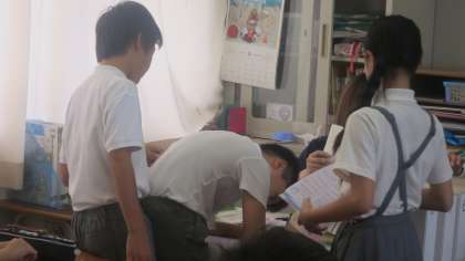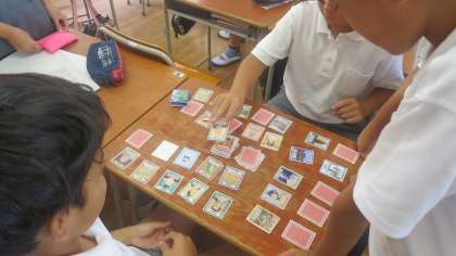 休み時間に6年生が「歴史カード(トランプ)」で遊んでいました。どうやら自分たちだけのルールがあるみたいなのですが、見ててもさっぱりわかりません。しかもゲーム名は「たこやき」というらしいです、本当に。「勝った!」「うわ負けた」…。本人たちは楽しんでいるのですが…。その奥では先生に呼ばれて補習を受けている子がいました。もしかしたら質問をしているのかもしれませんね。頑張ってください。