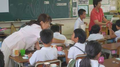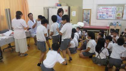 今日は4年生に、校医先生や歯科衛生士の先生に来ていただきました。そして歯の大切さ、虫歯の原因、歯みがき、フッ化物などについて教えていただきました。先生からは「フッ化物を塗ることで歯の質を強くするけれど、普段からの食生活や歯みがきなどの規則正しい生活をすることが予防には大切です。」「よい歯みがき習慣を身につけましょう。」などのお話がありました。学習後には保健室でフッ化物塗布を行いました。
