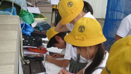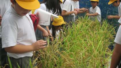 5年生が稲の成長の観察記録をつけていました。「夏は緑色やったのに黄色くなってきてるで」「これ、何粒くらいあるんやろ?」「うちの76センチやけど、曲がってる部分のばして測ってもいいんかな?」「もう食べれるんかな?」など、子どもなりの疑問が飛び出していました。