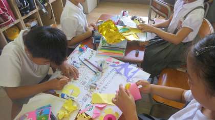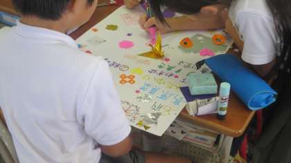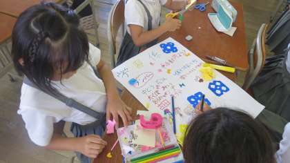 3年生が学級内でのそれぞれの係について紹介する掲示物を作っていました。楽しそうに折り紙を折ったり画用紙を切ったりしながら、かわいらしく仕上げていきます。こういう活動のときはついついおしゃべりが多くなってしまうのですが、またそのようすが微笑ましく見えてしまうんですよね。