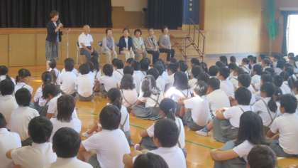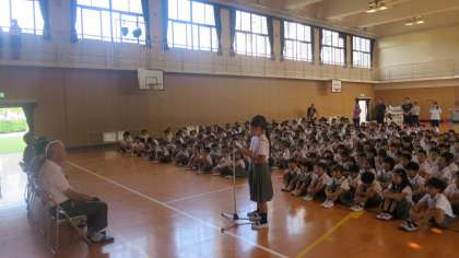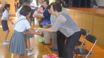 今日の児童集会で老人クラブの方々に来ていただきました。子どもたちが気持ちを込めて作った敬老の日のプレゼントをお渡ししました。校長先生の話の後に、児童代表のことばがありました。「いつも見守ってくれてありがとうございます。」「いつまでも元気でいてください。」「運動会頑張るので見に来てください。」と立派に大きな声で発表していました。老人クラブの方からもお礼のごあいさつをいただきました。子どもたちが作ったプレゼントは、10月9日に行われる「敬老大会」で地域のお年寄りの方々に配られます。きっと喜んでいただけると思います。