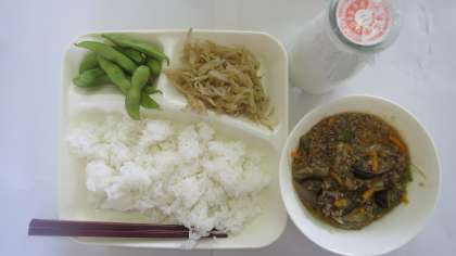 今日の給食のメニューは、マーボーなす、もやしのごま酢あえ、枝豆、牛乳、ごはん、です。マーボーなすはちょうどよいとろみ具合で細かく刻まれた野菜や挽肉にしょうがとトウバンジャンの香りが効いていました。なすもやわらかくて、ごはんとの相性もばっちりでした。もやしのごま酢あえはごま油と酢がもやしにほどよくからんで、さっぱりとした仕上がりでした。枝豆も豆につやがありました。給食室に食器を返しにきた子どもたちが「おいしい給食ごちそうさまでした」と言っていました。