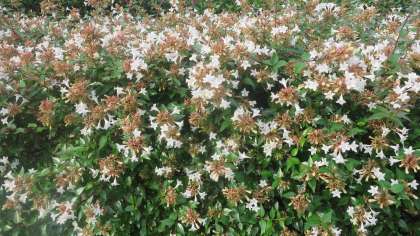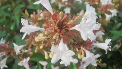 正門横芝生広場の柵沿いに植えているアベリアの花が咲いていました。アベリアは春から秋にかけて鐘形の小さな花をたくさん咲かせる常緑性の低木です。丈夫で育てやすいことから、庭木や生垣、公園樹、街路樹としてその姿を見ることができます。