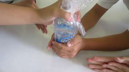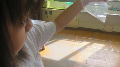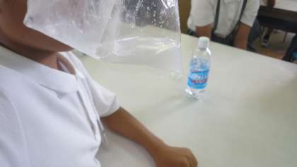 「炭酸水からは泡が出てくる。何か気体がとけているのだろうか、調べてみよう。」ということで6年生が実験をしていました。炭酸水を温めたり振ったりしながら、ビニールぶくろに出てきた気体を集めていました。そこに石灰水を入れると、白くにごりました。ということは、炭酸水にとけている気体は二酸化炭素ということがわかりました。子どもたちが大好きな炭酸ジュースには二酸化炭素がとけているということになります。あまりたくさん飲まないほうがいいかもしれませんね。