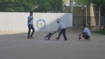連休の間に台風が通り過ぎました。警報も出ましたが、みなさん被害はありませんでしたか。学校の方も見回ったところ、特に異常は見られませんでした。運動場に引いていたラインが全部消えてしまっているので、運動会の練習のために朝から職員がラインを引き直しています。