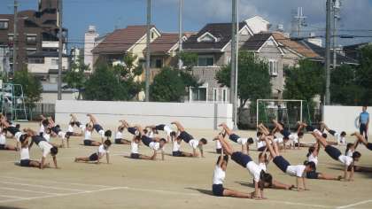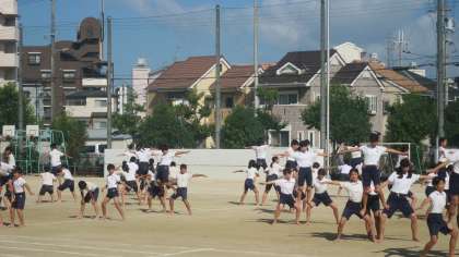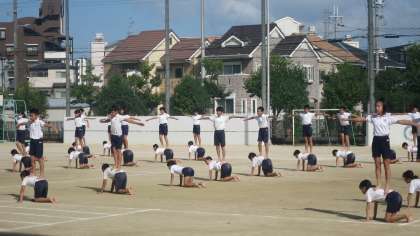 さわやかな風が吹く中、6年生が練習を重ねています。練習はじめの頃は一つ一つの技をするたびに声を出したり土をはらったりしていましたが、最近では集中力も高まり私語もなく立派なようすです。みんなで一つの作品を作り上げるという意識が芽生えてきたみたいです。