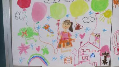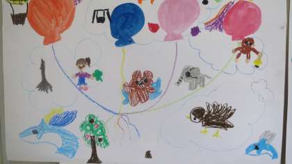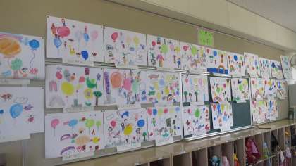 2年生の教室の後ろに絵が掲示してありました。テーマは「ふうせんがいっぱい」です。色とりどりのふうせんに囲まれた人物や動物が楽しそうに描かれています。メルヘンチックな絵が多かったですね。2年生らしい夢が広がる絵でした。教室の中がとても華やかになり、気持ちもウキウキしてきますね。
