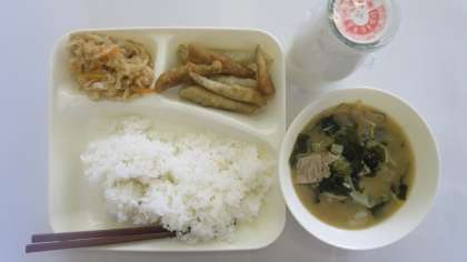 今日の給食のメニューは、いわしてんぷら、みそ汁、切り干し大根の炒め煮、牛乳、ごはん、でした。いわしてんぷらはころもがサクッと揚げられていて、かけつゆも天つゆ風でおいしかったです。みそ汁はしっかりとだしが効いていて、たまねぎやキャベツもやわらかく煮られていました。そのほかにも豚肉、もやし、オクラ、わかめも入っていて具だくさんでした。切り干しだいこんのいため煮はほんのり甘めのだしがしっかりとしみ込んでいてやさしい味に仕上がっていました。