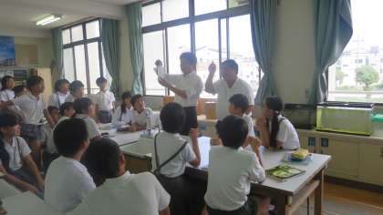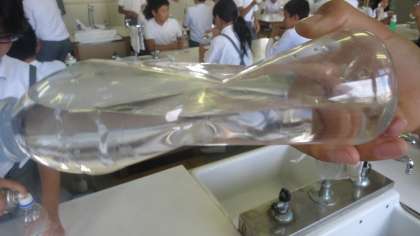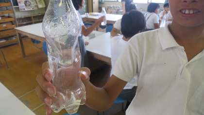 炭酸水に砂糖を入れると、二酸化炭素がボコボコッと泡を立てて出てきました。水を入れたペットボトルに二酸化炭素を入れて強く振ると、ボコッと大きくへこんでしまいました。子どもたちは目を丸くして驚き、そして喜んでいました。「うわっ、なんでなんで!」この気持ちが学習意欲へとつながっていくんですね。