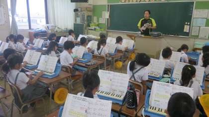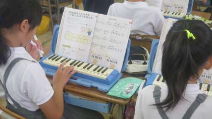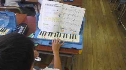 2年生の教室から心地よいリズムでけんばんハーモニカの音色が聞こえてきました。子どもたちが指をていねいに動かしながら「山のポルカ」という曲を演奏していました。楽譜をしっかりと見ながら、そしてみんなけんばんのドレミ…の場所を覚えているようでした。とってもスムーズでなめらかでした。