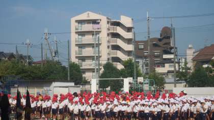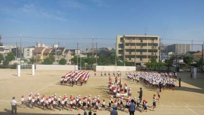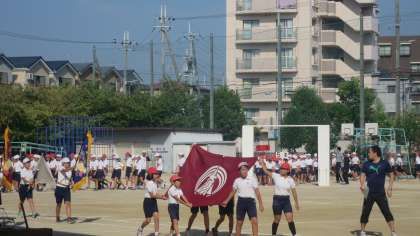 朝、一時間目より一回目の全体練習を行いました。今日は入場や退場、開閉会式の練習です。運動会の歌では応援団が前に出て大きな声で盛り上げていました。