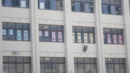 校舎の窓に運動会のスローガンが貼り出されました。今年は「いつでも全力 いつでも挑戦 最後まであきらめない 運動会にしよう」です。児童会を中心にみんなで決めました。当日は晴れるといいですね。