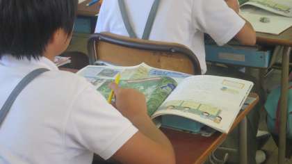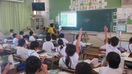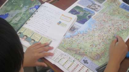 4年生が社会の授業で大阪府の地形のようすについて学習していました。先生の映し出す画像や地図帳を使ってみんなで確認していました。「大阪湾があります」「縦に長細いです」「淀川と大和川、大きな川が二本あります」「山に囲まれています」など気づいたことを次々と発表していました。自分たちの住んでいるところについて学習することはとても大切ですよね。