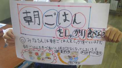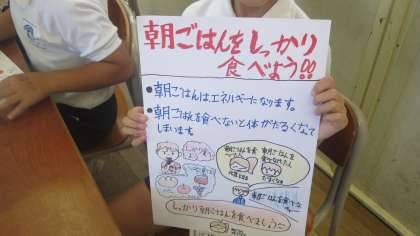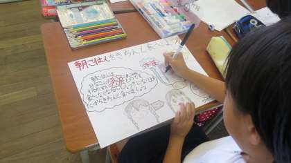 国語の授業でポスター作りをしていました。「保健室の先生が最近朝ごはんを食べない人が増えているのに気づき、朝ごはんをしっかりと食べてほしいと思って、ほけんだよりを書く」という設定です。だからみんな同じ「朝ごはんをしっかりと食べよう」というテーマです。子どもたちは、どうすれば伝えたいことが読み手にうまく伝えることができるか考えながらポスターを作っていました。