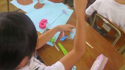 2年生が「おもちゃまつり」の準備をしていました。生活科の教科書を参考にしながらいくつかのおもちゃを作っていました。10月には1年生を招待して「おもちゃまつり」を開くそうです。「1年生に喜んでもらえるかな」…そんなことを考えながら着々と準備を進めていました。